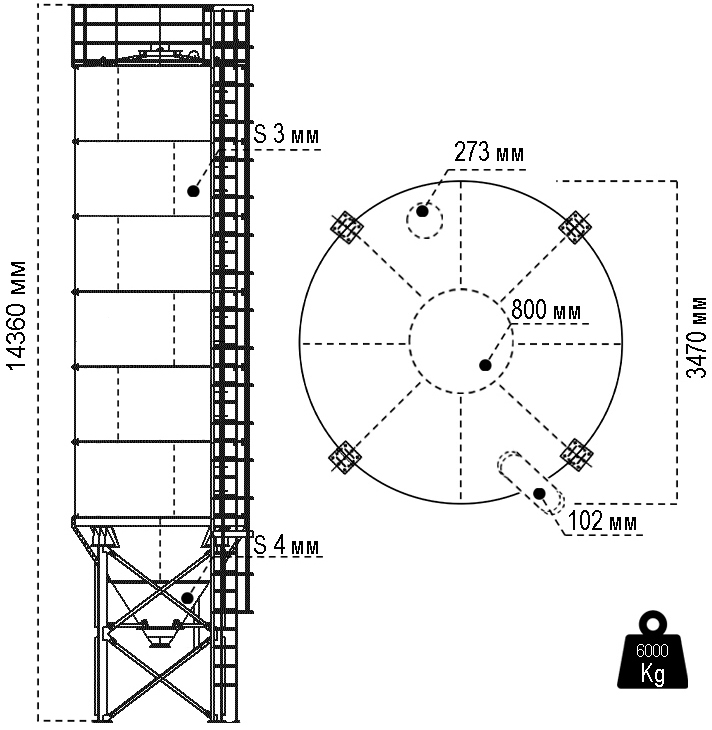| Высота силоса14360 мм | Толщина стенки секторов3 мм | Толщина стенки конуса4 мм |