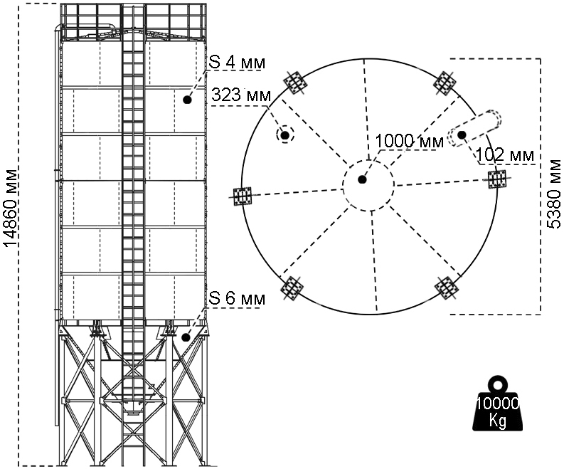 | Высота силоса14860 мм | Толщина стенки секторов4 мм | Толщина стенки конуса6 мм |