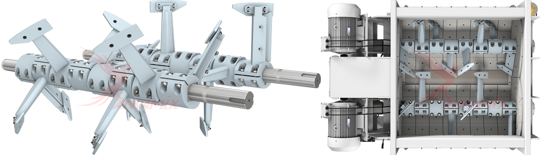 Смесительная группа двухвального бетоносмесителя C.M. Costruzioni Meccaniche s.r.l. MB 2500 — это перемешивающий вал, изготовленный из стали повышенного качества (Ç 1040 / Ç 1050) на котором установлены перемешивающие сварно-литые элементы (рычаги). Вся футеровка вала выполнена из износостойкого чугуна марки Ni-Hard4 содержащий 5–6% Ni и 8–9% Cr, которая для удобства замены крепится болтами.