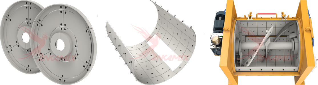 Броня корпуса одновального бетоносмесителя ELBA-WERK EMS 500 D — это литые пластины выполненные из износостойкого чугуна марки Ni-Hard4 содержащий 5–6% Ni и 8–9% Cr, которые крепятся винтовым способом к корпусу. Несмотря на то, что Ni-Hard4 с самого начала дороже, он превосходит другие легированные сплавы с точки зрения стойкости к истиранию.