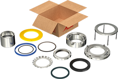 E18241/2 Ремкомплект уплотнительной группы с противоположенной стороны редуктора (свободная сторона) без подшипника для двухвального бетоносмесителя ELKON TW — это специально разработанный комплект герметизации вала, состоящий из ряда металлических и полиуретановых компонентов, который предотвращает протекание цементного молочка. При правильном плановом обслуживании ожидаемый срок службы каждого подшипника может превышать 500 000 м³ производства.