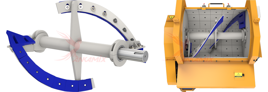 Смесительная группа для одновального бетоносмесителя МЕКА МB 0.5 А / 0.5 м³/цикл (750/500 л) — это перемешивающий вал, изготовленный из стали повышенного качества St52.3 / St37. Спирали вала футерованы литыми пластинами, а на рычагах установлены скребки. Вся футеровка вала выполнена из износостойкого чугуна марки Ni-Hard4 содержащий 5–6% Ni и 8–9% Cr, которая для удобства замены крепится болтами.