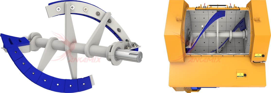 Смесительная группа для одновального бетоносмесителя МЕКА МB 1.0 B / 1.0 м³/цикл (1500/1000 л) — это перемешивающий вал, изготовленный из стали повышенного качества St52.3 / St37. Спирали вала футерованы литыми пластинами, а на рычагах установлены скребки. Вся футеровка вала выполнена из износостойкого чугуна марки Ni-Hard4 содержащий 5–6% Ni и 8–9% Cr, которая для удобства замены крепится болтами.
