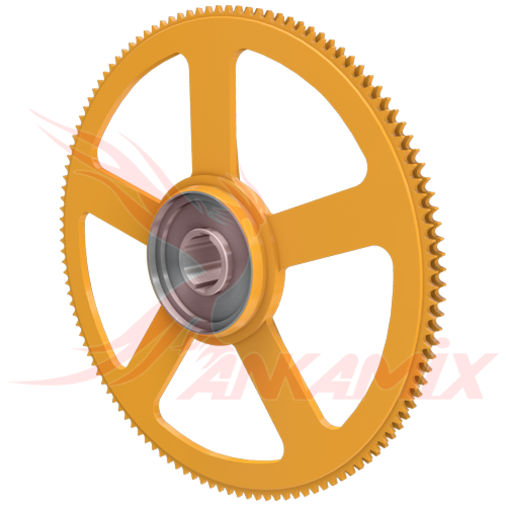 1001558 Цельнолитое спицевое зубчатое колесо - ведомое для одновального бетоносмесителя MEKA MB 2.0 A - это элемент цепной передачи с которого считывается крутящий момент. Двухрядное зубчатое колесо выполнено из ковкого чугуна марки GGG50 / SFERO и состоит из трёх основных компонентов: венец с зубьями, ступицу и тело в виде спиц таврового сечения. Чтобы закрепить колесо на вал бетоносмесителя, в центре диска располагается ступица, имеющая сквозное отверстие цилиндрической формы со шпоночными пазами.