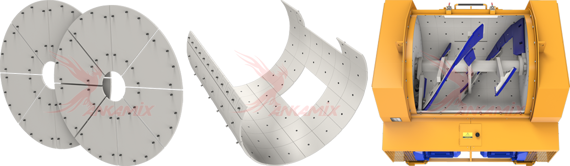 Футеровка корпуса (броня корпуса) для одновального бетоносмесителя МЕКА МB 2.0 A / 2.0 м³/цикл (3000/2000 л) — это литые пластины выполненные из износостойкого чугуна марки Ni-Hard4 содержащий 5–6% Ni и 8–9% Cr, которые крепятся винтовым способом к корпусу. Несмотря на то, что Ni-Hard4 с самого начала дороже, он превосходит другие легированные сплавы с точки зрения стойкости к истиранию.