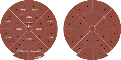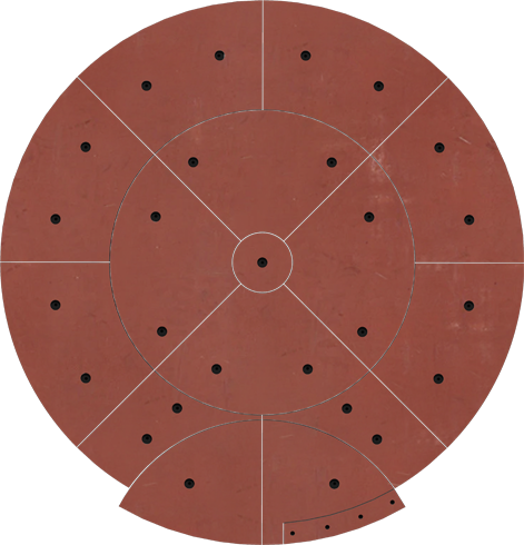 Комплект донной брони для планетарного бетоносмесителя S.I.CO.MA. S.r.l. MP 375/250 | P 250 производительностью 0.25 м³/час с одним выгрузочным затвором представляет собой набор сегментов, закреплённые винтовым способом с внутренней стороны смесительной ёмкости. Сегменты брони изготавливаются из износостойкой стали Hardox твёрдостью 425 - 475 HBW (S = 12 мм).