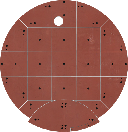 Комплект донной брони для планетарного бетоносмесителя S.I.CO.MA. S.r.l. MP 750/500 производительностью 0.5 м³/час с одним выгрузочным затвором представляет собой набор сегментов, закреплённые винтовым способом с внутренней стороны смесительной ёмкости. Сегменты брони изготавливаются из износостойкой стали Hardox твёрдостью 425 - 475 HBW (S = 12 мм).