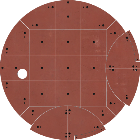 Комплект донной брони для планетарного бетоносмесителя S.I.CO.MA. S.r.l. P 500 (RS) производительностью 0.5 м³/час с двумя выгрузочными затворами представляет собой набор сегментов, закреплённые винтовым способом с внутренней стороны смесительной ёмкости. Сегменты брони изготавливаются из износостойкой стали Hardox твёрдостью 425 - 475 HBW (S = 12 мм).