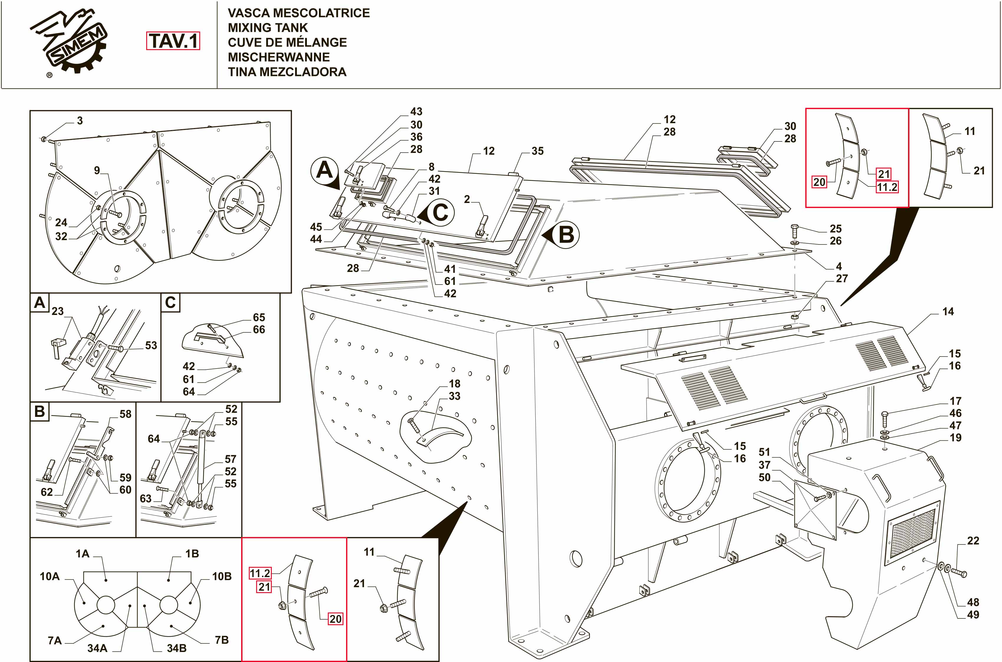 TAV.1/00F6 Комплект брони корпуса для двухвального бетоносмесителя SIMEM MSO 3000 (2.0 м³/цикл) представляет собой набор из 72 штук отлитых пластин (s ≈ 18 мм), выполненных из хромистого, высоколегированного, износостойкого, жаростойкого чугуна марки ЧХ16 ГОСТ 7769-82 (твердость HB 10 ⁻¹ = 400 - 450 МПа), закреплённых винтовым способом с внутренней стороны смесительной ёмкости. Броня обеспечивает защитой корпус от механических — ударных, истирающих воздействий высоко абразивных инертных материалов. Сегменты расположенные сверху подвержены меньшему износу, чем расположенные на дне, поэтому можно менять их местами.