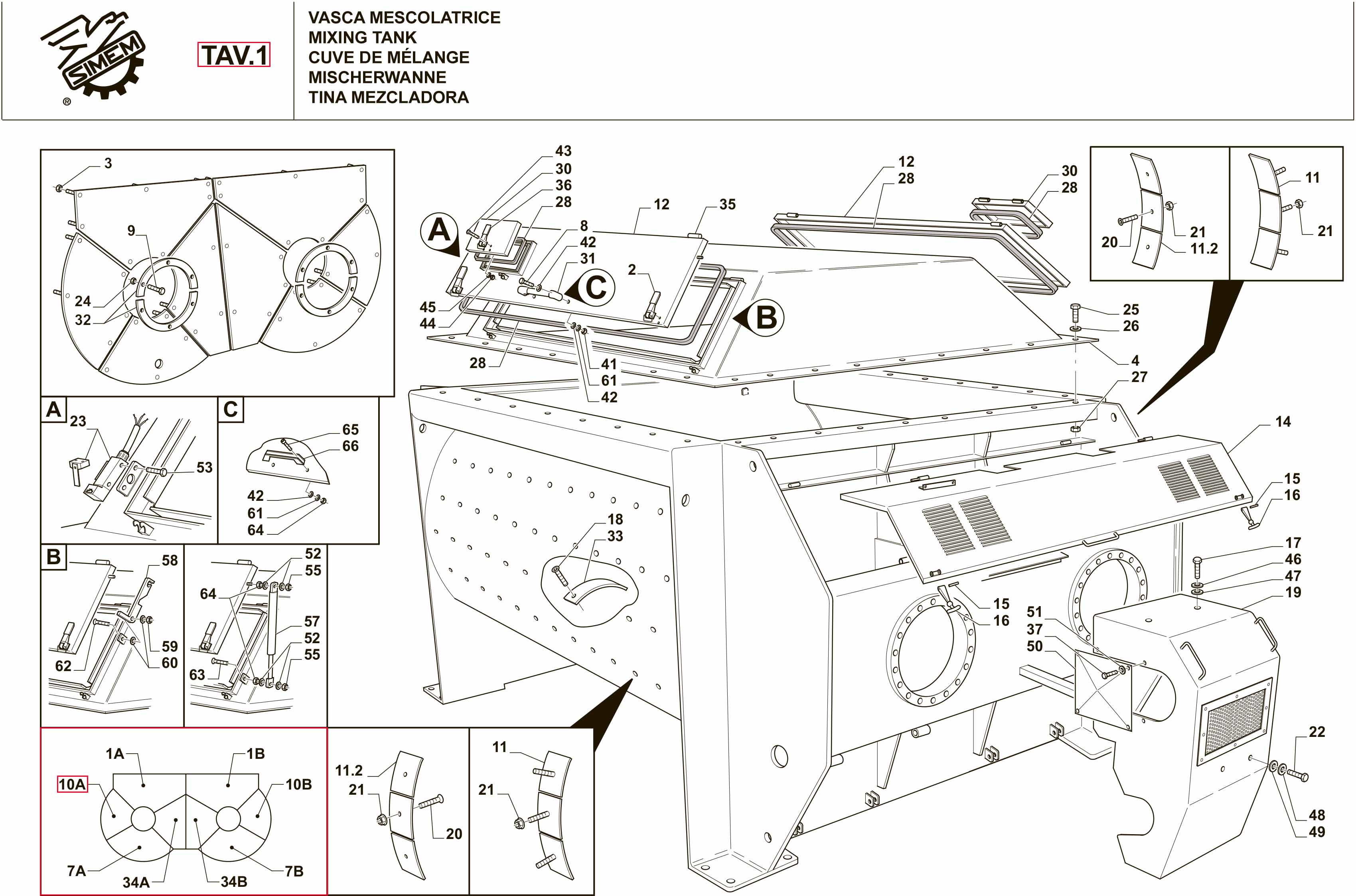 TAV.1/10A Сегмент торцевой брони для двухвального бетоносмесителя SIMEM MSO 3000 (2.0 м³/цикл) представляет собой пластину (s ≈ 12 мм), вырезанную по чертежу из нелегированной, конструкционной, износостойкой, листовой стали марки St 52.3 ГОСТ 5520-79 (твердость HB 10 ⁻¹ = 510 МПа), закреплённую винтовым способом с внутренней стороны смесительной ёмкости. Броня обеспечивает защитой торцевые стенки смесителя от механических — ударных, истирающих воздействий высоко абразивных инертных материалов.