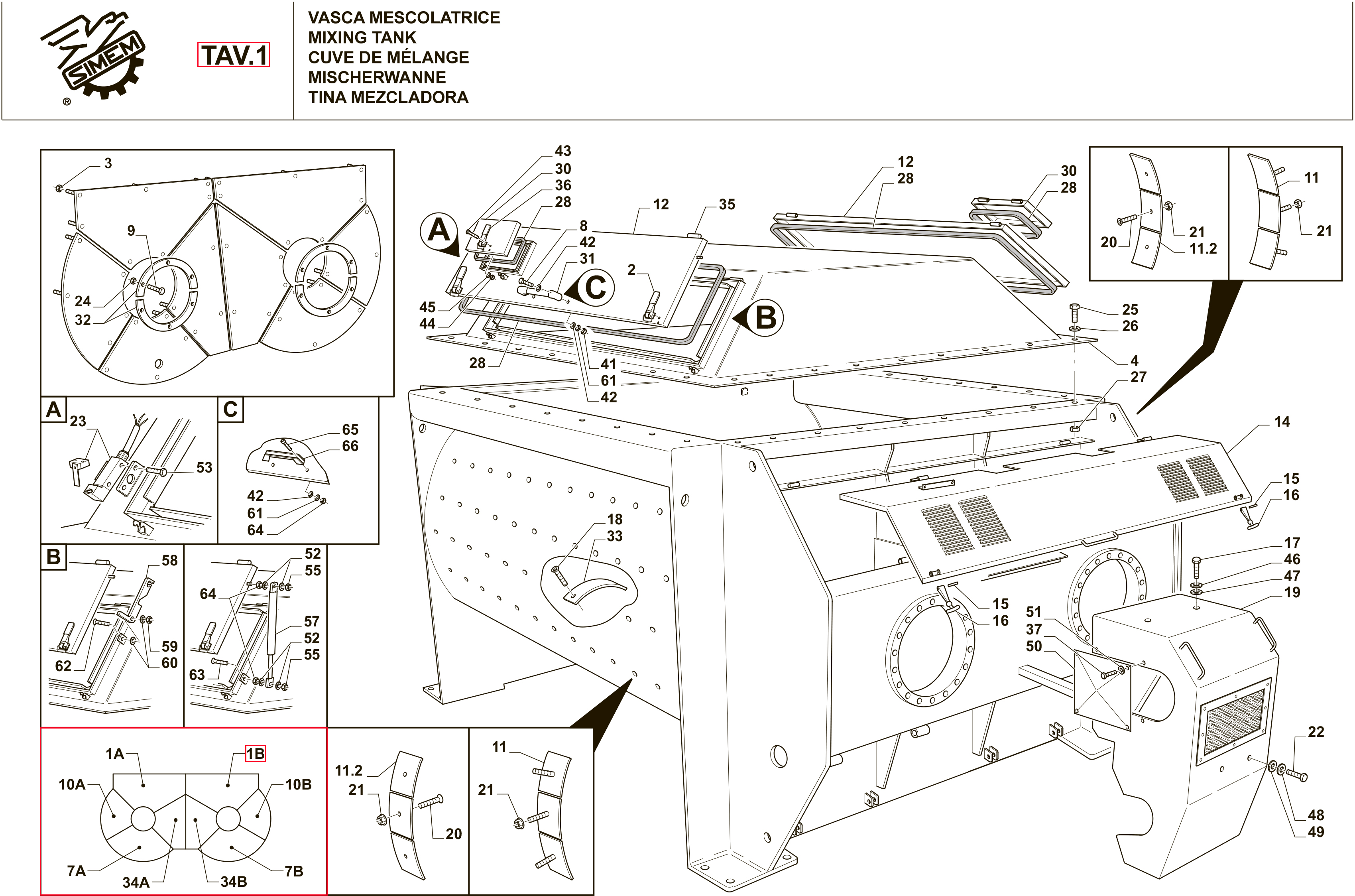 TAV.1/1B Сегмент торцевой брони для двухвального бетоносмесителя SIMEM MSO 3000 (2.0 м³/цикл) представляет собой пластину (s ≈ 12 мм), вырезанную по чертежу из нелегированной, конструкционной, износостойкой, листовой стали марки St 52.3 ГОСТ 5520-79 (твердость HB 10 ⁻¹ = 510 МПа), закреплённую винтовым способом с внутренней стороны смесительной ёмкости. Броня обеспечивает защитой торцевые стенки смесителя от механических — ударных, истирающих воздействий высоко абразивных инертных материалов.