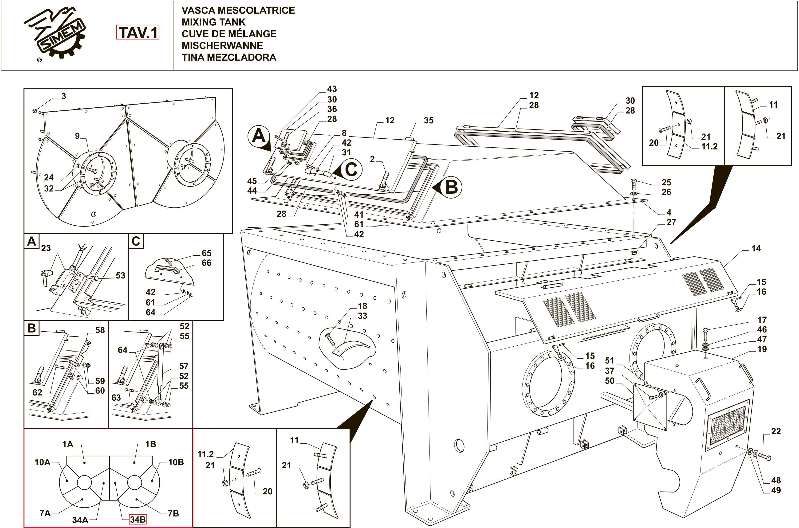 TAV.1/34B Сегмент торцевой брони для двухвального бетоносмесителя SIMEM MSO 3000 (2.0 м³/цикл) представляет собой пластину (s ≈ 12 мм), вырезанную по чертежу из нелегированной, конструкционной, износостойкой, листовой стали марки St 52.3 ГОСТ 5520-79 (твердость HB 10 ⁻¹ = 510 МПа), закреплённую винтовым способом с внутренней стороны смесительной ёмкости. Броня обеспечивает защитой торцевые стенки смесителя от механических — ударных, истирающих воздействий высоко абразивных инертных материалов.