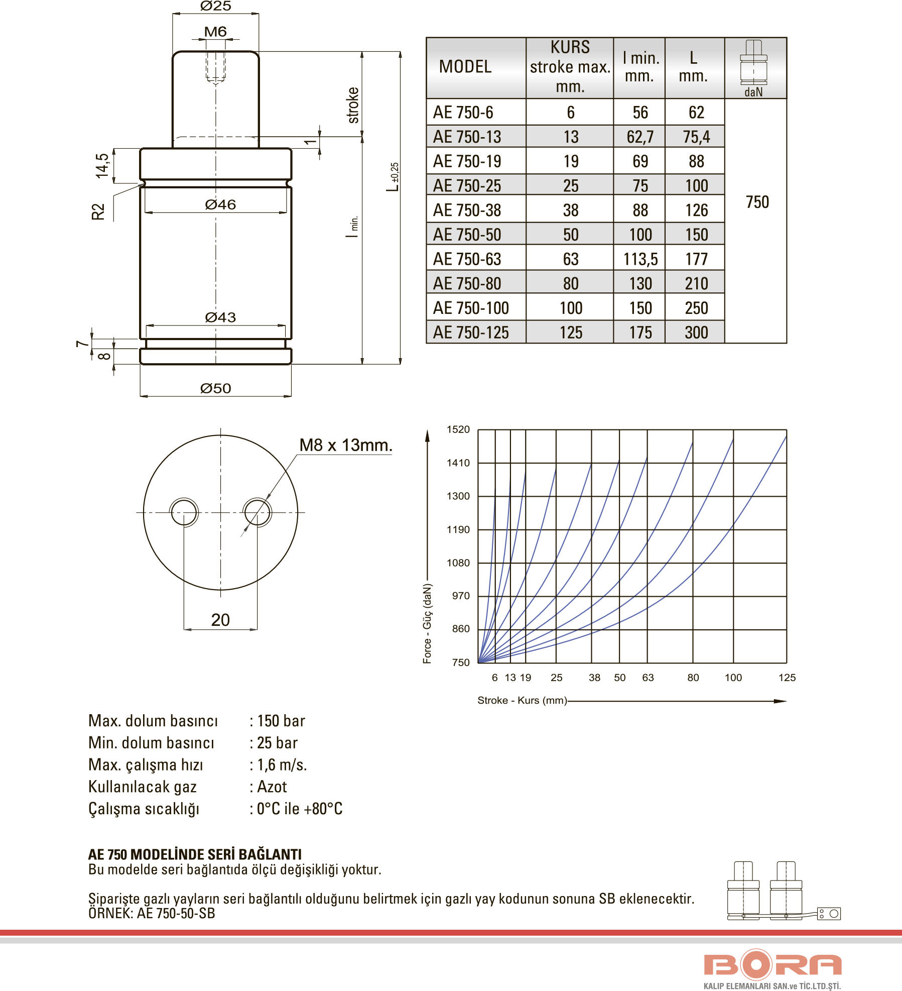 Азотная газовая пружина SML Gas AE 750-6-SB для пресс-форм и штампов от крупного турецкого производителя Bora Kalıp Elemanları — предназначена для последовательного подключения в пневматическую систему, состоящую из нескольких и более азотных газовых пружин, контролируемые панелью управления. Цель и задача последовательного подключения – это постоянный контроль, а также коррекция давления в каждой газовой пружине, находящейся в цепи модуля. Газовые пружины SML Gas применяются в верхнем или нижнем разъёмах штамповочного пресса для производства металлической, резиновой, пластмассовой продукции. Их применяют в металлургической, автомобильной, полимерной промышленности.