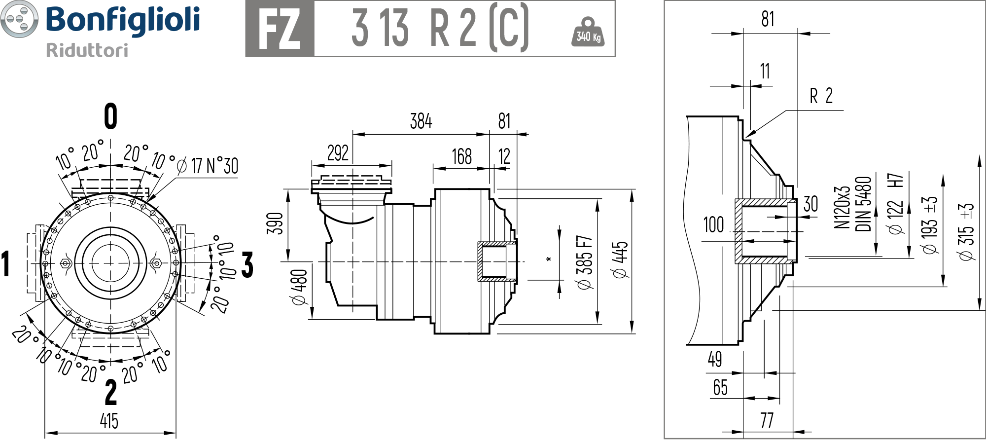 — Допустимая радиальная нагрузка при скорости на выходе n2 [Rn2]: 20800 / 23800 / 30000 N