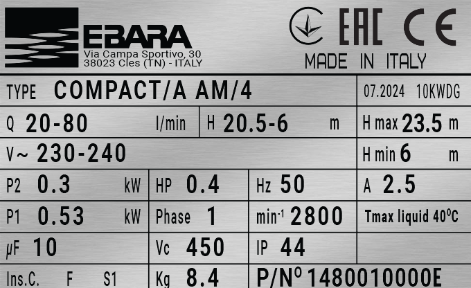 1480010000E Насос многоступенчатый горизонтальный EBARA Pumps Europe S.p.A. COMPACT/A AM/4 / Q: 4.8 м³/ч / H: 6 м / P: 0.3 кВт / n: 2800 об/мин — из чугуна с радиальным рабочим колесом из полифенила с полистиролом (ПФЭ+ПС со стекловолокном) предназначен для перекачки чистой воды: бытовая насосная станция, насосная станция общего назначения, садовые системы орошения, мойка автомобилей.