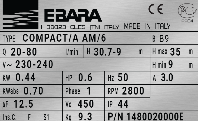 1480020000E Насос многоступенчатый горизонтальный EBARA Pumps Europe S.p.A. COMPACT/A AM/6 / Q: 4.8 м³/ч / H: 9 м / P: 0.44 кВт / n: 2800 об/мин — из чугуна с радиальным рабочим колесом из полифенила с полистиролом (ПФЭ+ПС со стекловолокном) предназначен для перекачки чистой воды: бытовая насосная станция, насосная станция общего назначения, садовые системы орошения, мойка автомобилей.