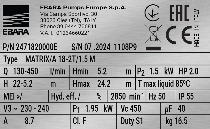 2471820000E Насос центробежный многоступенчатый горизонтальный EBARA Pumps Europe S.p.A. MATRIX/A 18-2T/1.5 M / Q: 27 м³/ч / H: 5.2 м / P: 1.5 кВт / n: 2850 об/мин — из нержавеющей стали AISI 304 (EN 1.4301) предназначен для перекачки питьевой воды: насосные станции, водоснабжение и очистка воды, отопление и кондиционирование, системы охлаждения, орошение в сельском хозяйстве, в том числе дождевой водой, промышленные мойки, промышленные установки.