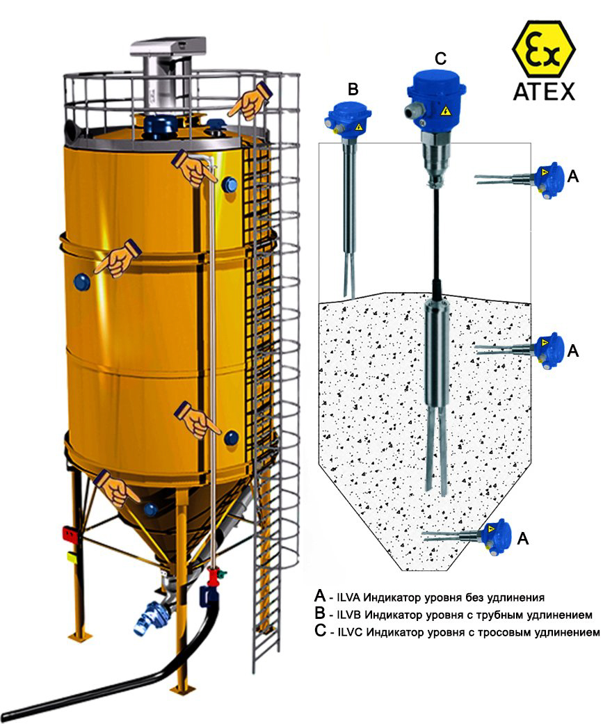 | Выходной сигналDPDT, max. 250 V AC, 8 A – max 30 V; DC, 5 A | Избыточное давление силосаPa - 1.0....Pa + 16.0 bar | Температура внутри ёмкости- 40˚С.…+ 150˚С |